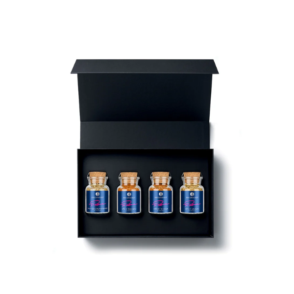 Segundo o lema “Coragem para apimentar!” As 4 misturas de especiarias do conhecido chef berlinense de 2 estrelas impressionam com sabores únicos: seja o picante floral da Pimenta Salgada Szechuan, o equilíbrio ideal entre doce e azedo no Sweet n Sour, os sabores intensos de tomate do Spicy Tomato ou o frutas cítricas frescas e quentes -Sabor de Limão Picante! Em vez de tirar as estrelas do céu, basta distribuí-las num copo! Nossa caixa de presente Tim Raue irá impressionar todos os fãs da cozinha estrelada e contém um mundo único de sabores que irá deliciar todos os gourmets. Esta caixa impressiona não só pelos seus valores internos, mas também visualmente!